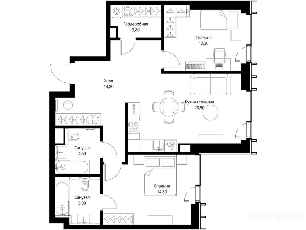 Пространство ощущается благодаря высоте потолков в 2,95 м. Отсутствие балконов, конечно, может расстроить, но панорамные окна во всю стену компенсируют этот недостаток, открывая прекрасный вид и наполняя квартиру светом.