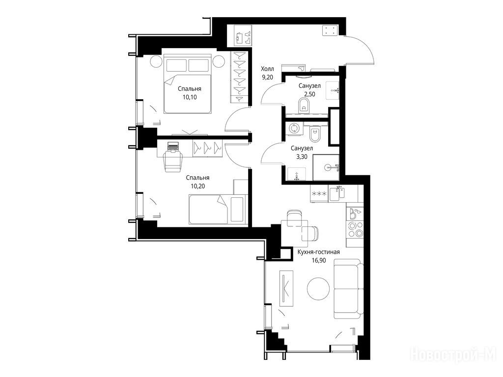 Пространство ощущается благодаря высоте потолков в 2,95 м. Отсутствие балконов, конечно, может расстроить, но панорамные окна во всю стену компенсируют этот недостаток, открывая прекрасный вид и наполняя квартиру светом.