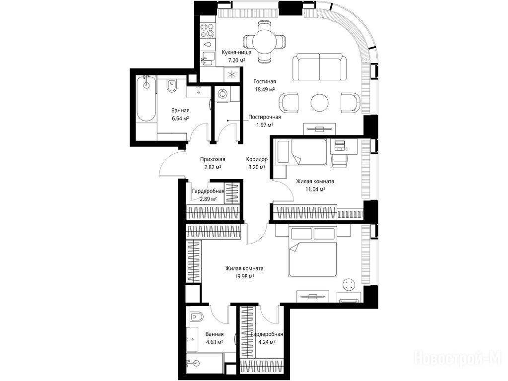 Пространство ощущается благодаря высоте потолков в 2,95 м. Отсутствие балконов, конечно, может расстроить, но панорамные окна во всю стену компенсируют этот недостаток, открывая прекрасный вид и наполняя квартиру светом.