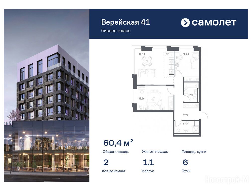Продается двухкомнатная квартира в новостройке ЖК «Верейская 41» по адресу Москва, ЗАО, Можайский, ул. Верейская, д. 41, корп. 1.1. Общая площадь квартиры - 60.42 кв. м. Тип проекта, по которому построен дом — Монолитно-кирпичный, компания-застройщик — АО СЗ «Самолет-Верейская», Группа «Самолет». Стоимость квартиры — 33 159 254 руб. Способы оплаты можно уточнить у продавца. Срок сдачи — 2 квартал 2026. Более подробная информация по телефону.