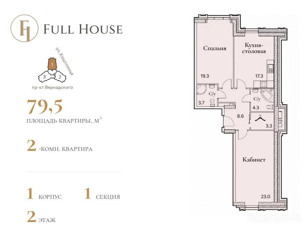 Продается однокомнатная квартира в новостройке Клубный дом Full House (Фул Хаус) по адресу Москва, ЗАО, Тропарево-Никулино, пр-т Вернадского, у станции метро «Юго-Западная». Общая площадь квартиры - 79.9 кв. м. Тип проекта, по которому построен дом — Монолитно-кирпичный, компания-застройщик — Sezar Group (Сезар Групп), ООО ФИРМА «Илион-Трейд». Стоимость квартиры — 41 548 000 руб. Способы оплаты можно уточнить у продавца. Более подробная информация по телефону.