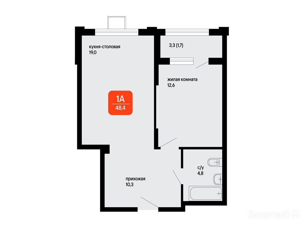 1-комн. квартира, 48.40 м2, 1 этаж