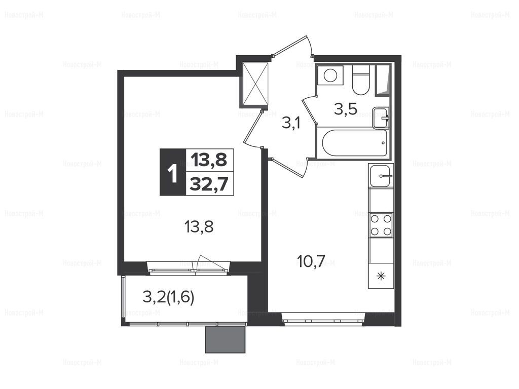 1-комн. квартира, 32.60 м2, 12 этаж