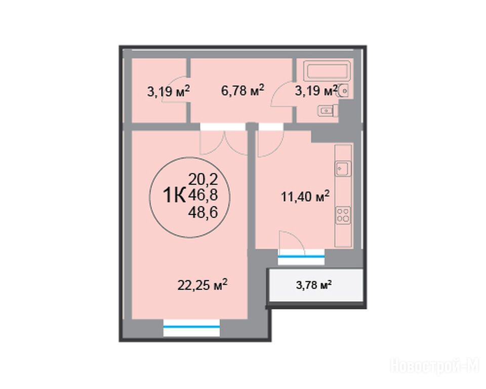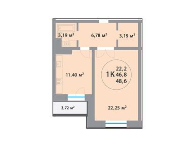 1-комн. квартира, 46.90 м2, 18 этаж