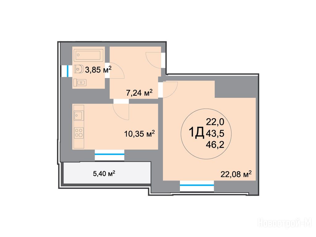 1-комн. квартира, 43.70 м2, 2 этаж