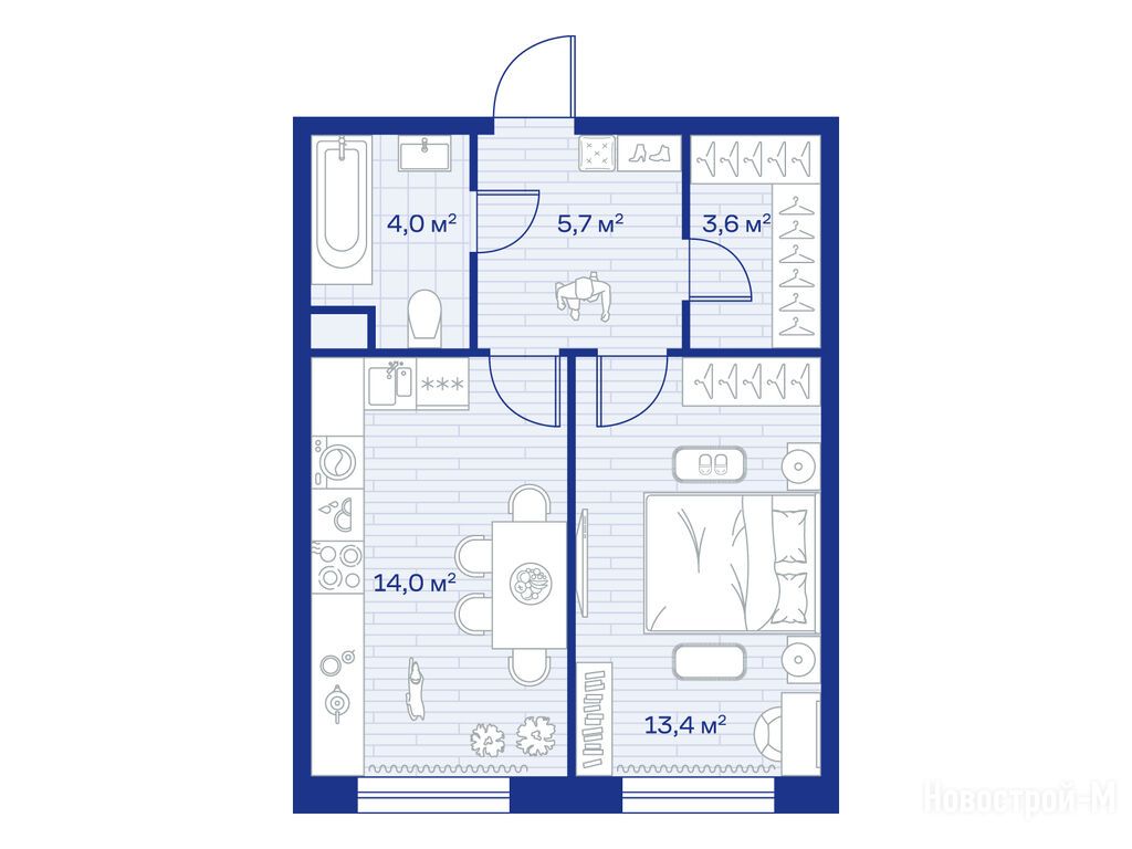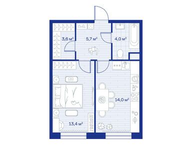 1-комн. квартира, 40.70 м2, 2 этаж