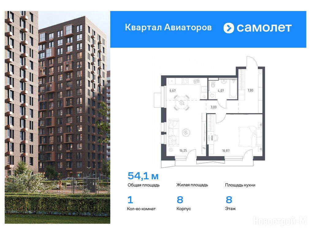 Продается однокомнатная квартира в новостройке ЖК «Квартал Авиаторов» по адресу Московская область, Балашиха городской округ, Балашиха, ул. Кожедуба, корп. 8. Общая площадь квартиры - 54.1 кв. м. Тип проекта, по которому построен дом — Монолитно-кирпичный, компания-застройщик — ООО СЗ «Реновация-Балашиха», Группа «Самолет». Стоимость квартиры — 14 032 154 руб. Способы оплаты можно уточнить у продавца. Более подробная информация по телефону.