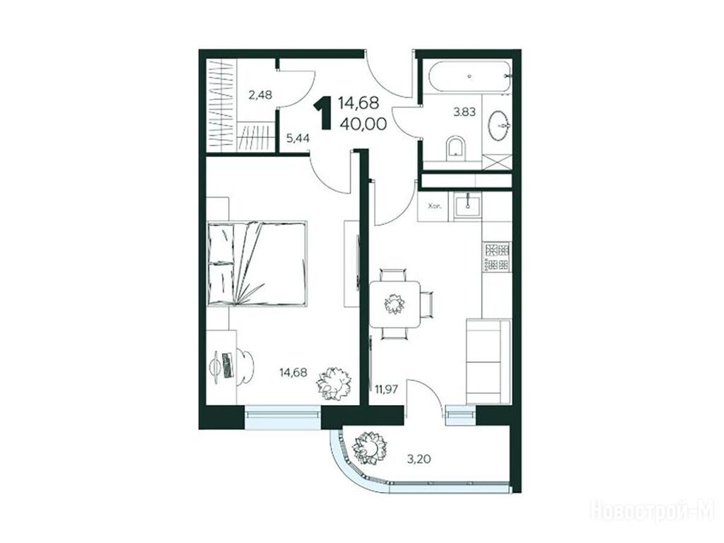 1-комн. квартира, 40.00 м2, 9 этаж