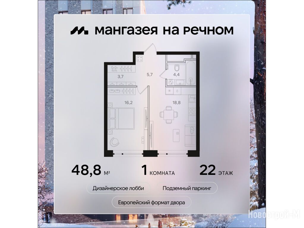 Продается однокомнатная квартира в новостройке ЖК «Мангазея на Речном» по адресу Москва, САО, Левобережный, Ленинградское ш., вл. 57, 63. Общая площадь квартиры - 48.8 кв. м. Тип проекта, по которому построен дом — Монолит, компания-застройщик — «Мангазея». Стоимость квартиры — 29 099 440 руб. Способы оплаты можно уточнить у продавца. Срок сдачи — 3 квартал 2027. Более подробная информация по телефону.