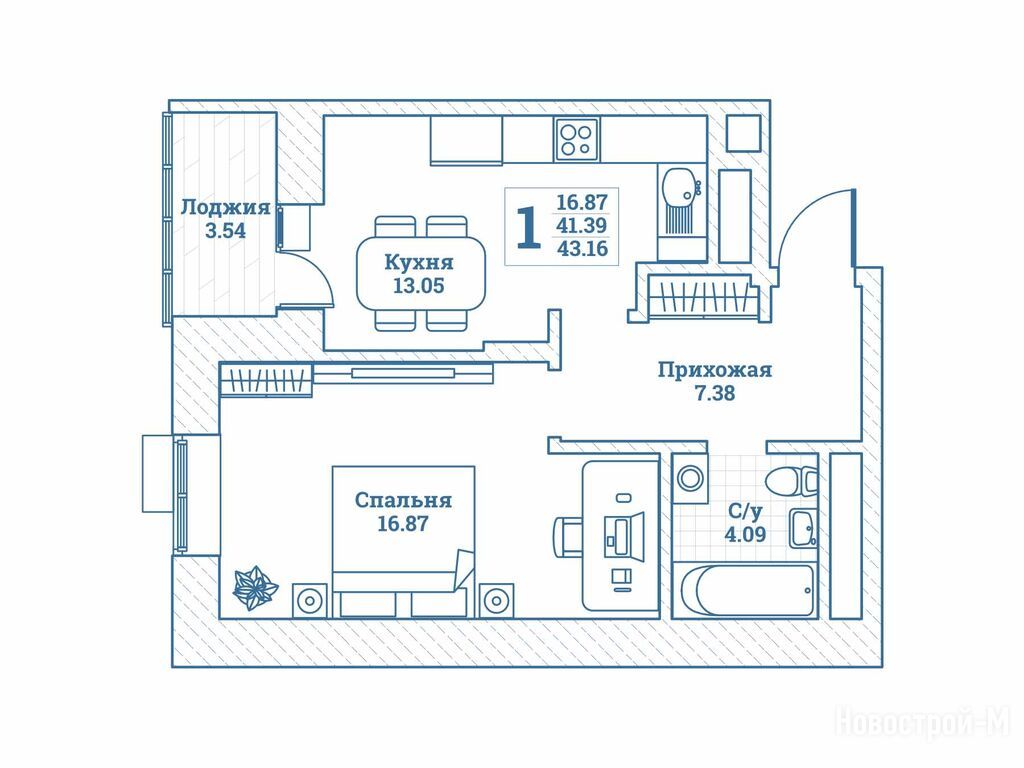 1-комн. квартира, 43.16 м2, 2 этаж