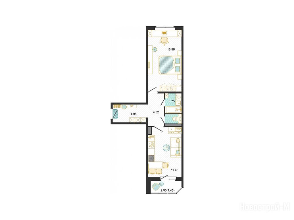 1-комн. квартира, 44.90 м2, 1 этаж