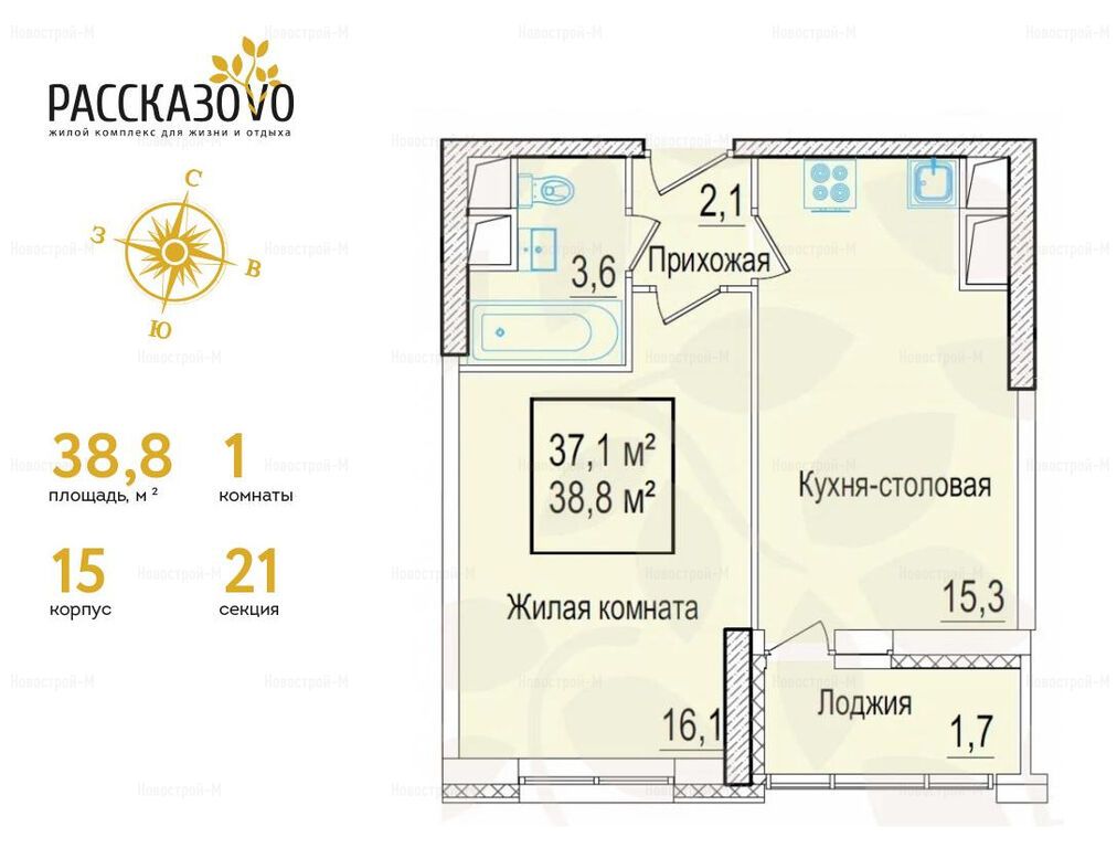 Продается однокомнатная квартира в новостройке ЖК «Рассказово» по адресу Москва, ТиНАО, Новомосковский АО, Внуковское С/П, Рассказовка деревня, бульвар Андрея Тарковского, д. 10. Общая площадь квартиры - 38.8 кв. м. Тип проекта, по которому построен дом — Монолитно-кирпичный, компания-застройщик — Sezar Group (Сезар Групп). Стоимость квартиры — 15 132 000 руб. Способы оплаты можно уточнить у продавца. Более подробная информация по телефону.
