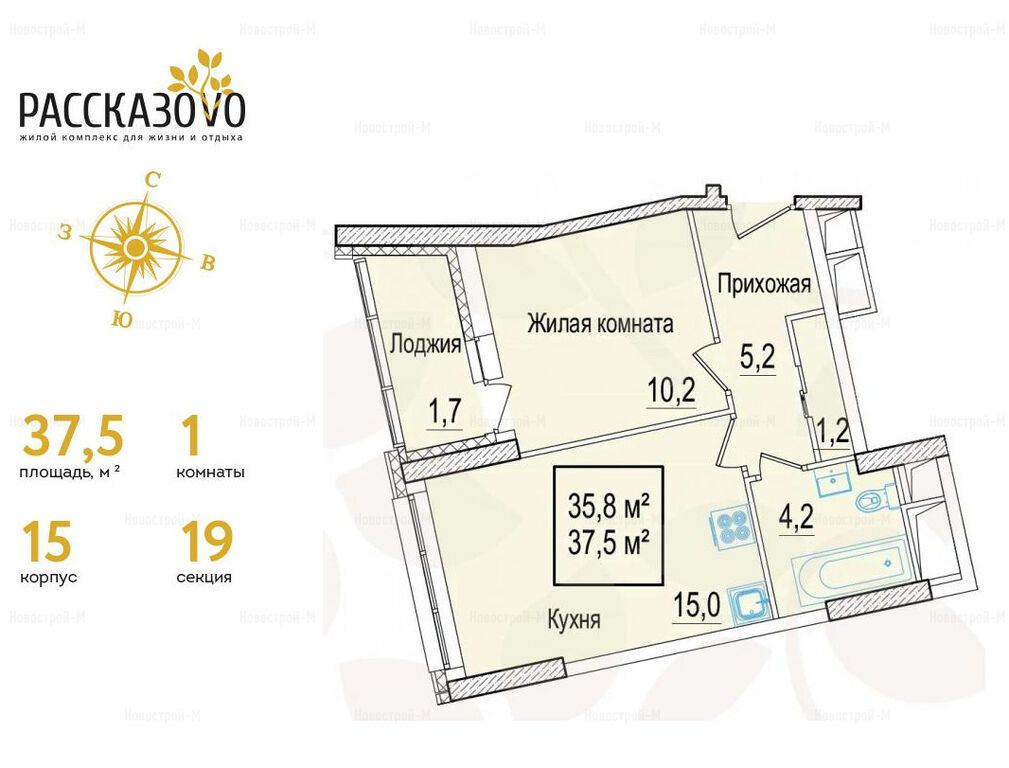 Продается однокомнатная квартира в новостройке ЖК «Рассказово» по адресу Москва, ТиНАО, Новомосковский АО, Внуковское С/П, Рассказовка деревня, бульвар Андрея Тарковского, д. 10. Общая площадь квартиры - 37.5 кв. м. Тип проекта, по которому построен дом — Монолитно-кирпичный, компания-застройщик — Sezar Group (Сезар Групп). Стоимость квартиры — 14 625 000 руб. Способы оплаты можно уточнить у продавца. Более подробная информация по телефону.