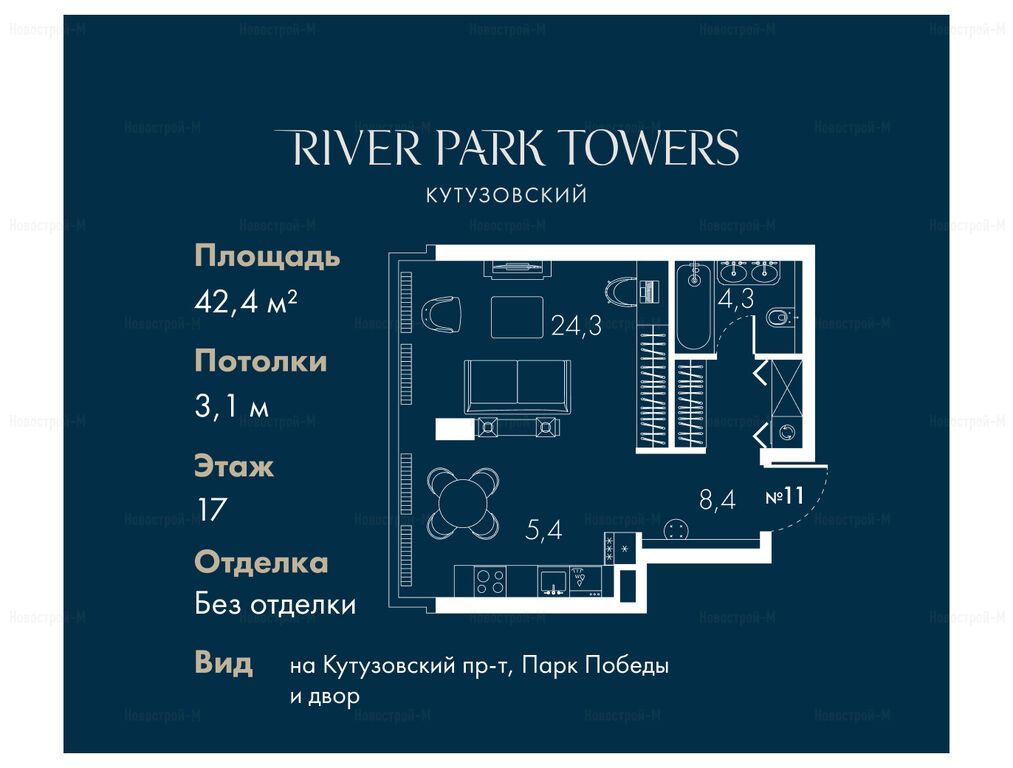 Продается однокомнатная квартира в новостройке ЖК «Ривер Парк Кутузовский» по адресу Москва, ЗАО, Дорогомилово, Кутузовский проезд, владение 16А/1, корп. 1 (Топаз). Общая площадь квартиры - 42.4 кв. м. Тип проекта, по которому построен дом — Монолитно-кирпичный, компания-застройщик — АЕОН Девелопмент. Стоимость квартиры — 45 929 557 руб. Способы оплаты можно уточнить у продавца. Срок сдачи — 3 квартал 2026. Более подробная информация по телефону.