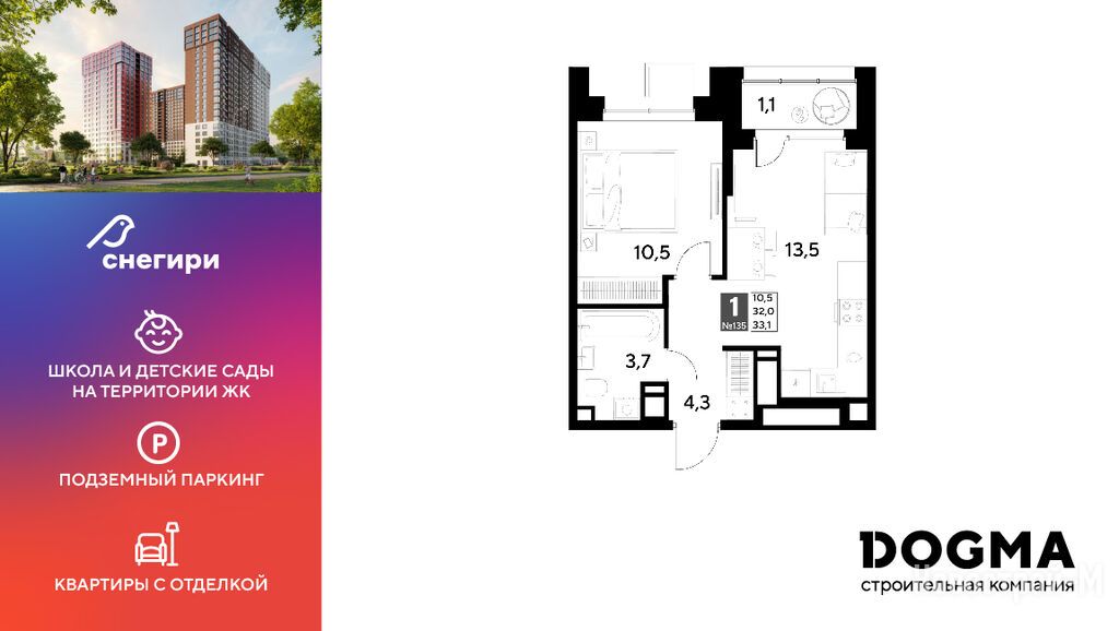 Продается однокомнатная квартира в новостройке ЖК «Снегири» по адресу Омская область, Омск, ул. Светловская, корп. 1. Общая площадь квартиры - 33.1 кв. м. Тип проекта, по которому построен дом — Монолитно-кирпичный, компания-застройщик — DOGMA, ООО СЗ ДОГМА-ОМСК. Стоимость квартиры — 7 073 470 руб. Способы оплаты можно уточнить у продавца. Срок сдачи — 2 квартал 2027. Более подробная информация по телефону.