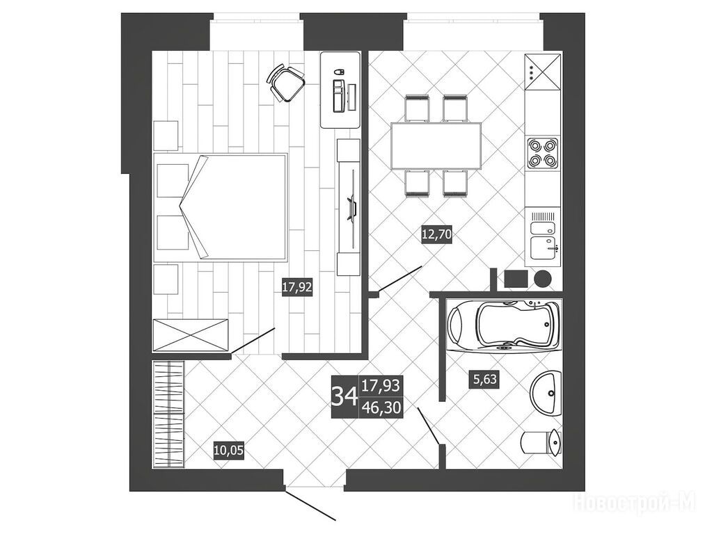 1-комн. квартира, 46.30 м2, 3 этаж