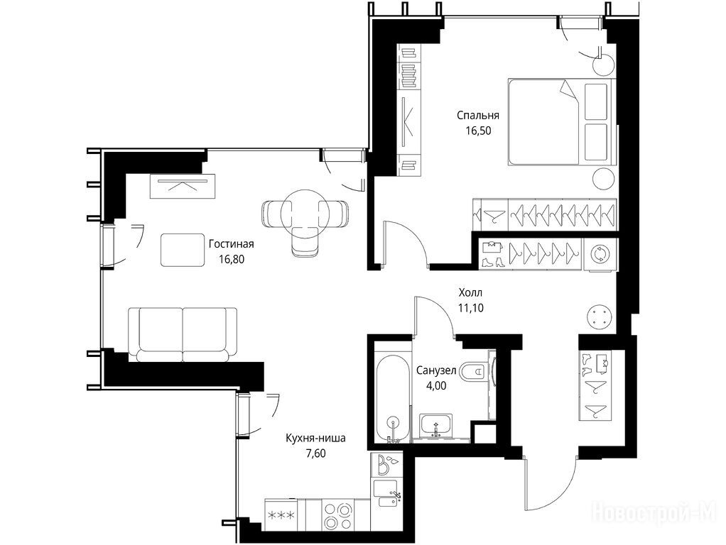 Пространство ощущается благодаря высоте потолков в 2,95 м. Отсутствие балконов, конечно, может расстроить, но панорамные окна во всю стену компенсируют этот недостаток, открывая прекрасный вид и наполняя квартиру светом.