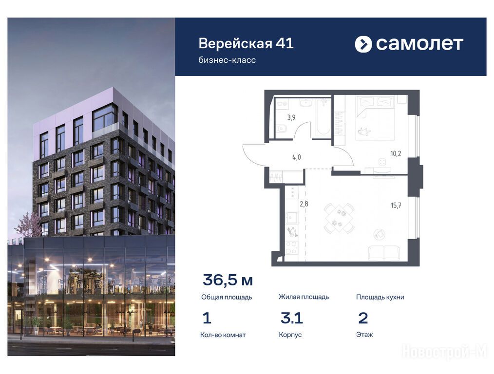 Продается однокомнатная квартира в новостройке ЖК «Верейская 41» по адресу Москва, ЗАО, Можайский, Верейская 41, корп. 3.1. Общая площадь квартиры - 36.52 кв. м. Тип проекта, по которому построен дом — Монолитно-кирпичный, компания-застройщик — АО СЗ «Самолет-Верейская», Группа «Самолет». Стоимость квартиры — 21 742 047 руб. Способы оплаты можно уточнить у продавца. Срок сдачи — 4 квартал 2025. Более подробная информация по телефону.