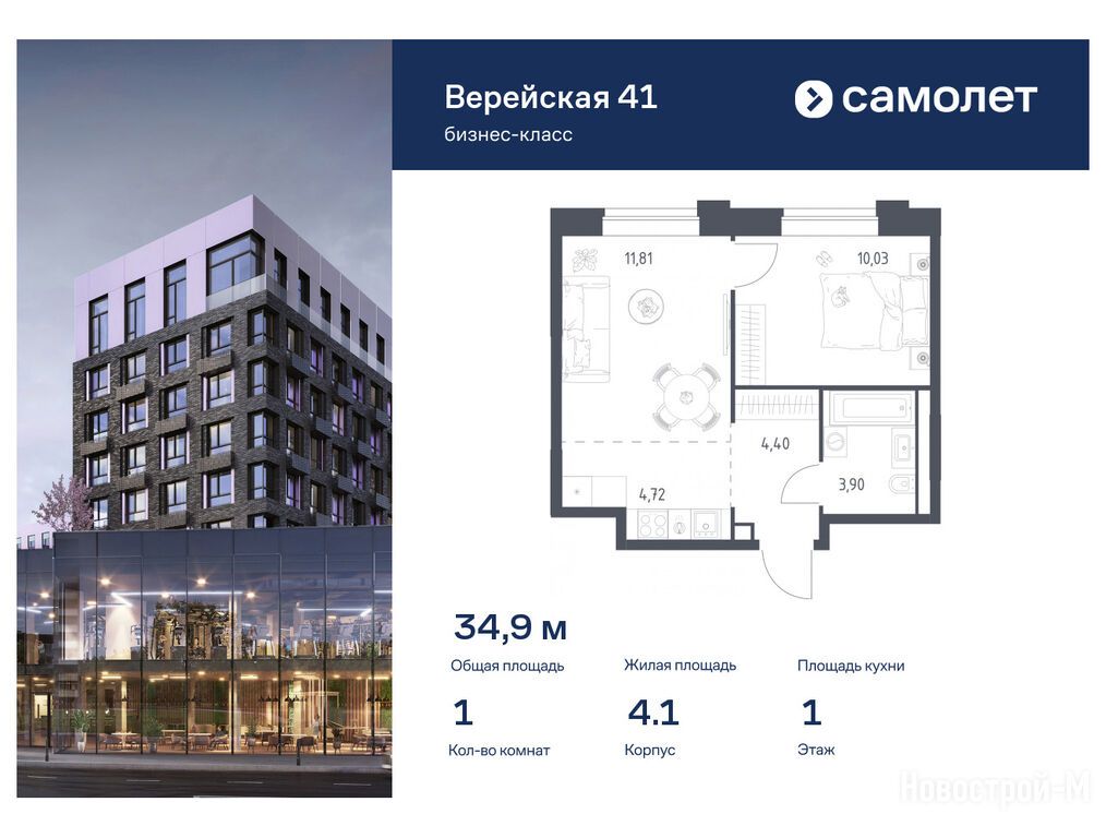 Продается однокомнатная квартира в новостройке ЖК «Верейская 41» по адресу Москва, ЗАО, Можайский, МФК «Верейская 41», корп. 4.1. Общая площадь квартиры - 34.86 кв. м. Тип проекта, по которому построен дом — Монолитно-кирпичный, компания-застройщик — АО СЗ «Самолет-Верейская», Группа «Самолет». Стоимость квартиры — 20 834 567 руб. Способы оплаты можно уточнить у продавца. Срок сдачи — 1 квартал 2026. Более подробная информация по телефону.