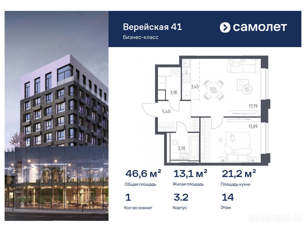 Продается однокомнатная квартира в новостройке ЖК «Верейская 41» по адресу Москва, ЗАО, Можайский, МФК «Верейская 41», корп. 3.2. Общая площадь квартиры - 46.61 кв. м. Тип проекта, по которому построен дом — Монолитно-кирпичный, компания-застройщик — АО СЗ «Самолет-Верейская», Группа «Самолет». Стоимость квартиры — 31 394 440 руб. Способы оплаты можно уточнить у продавца. Срок сдачи — 1 квартал 2026. Более подробная информация по телефону.