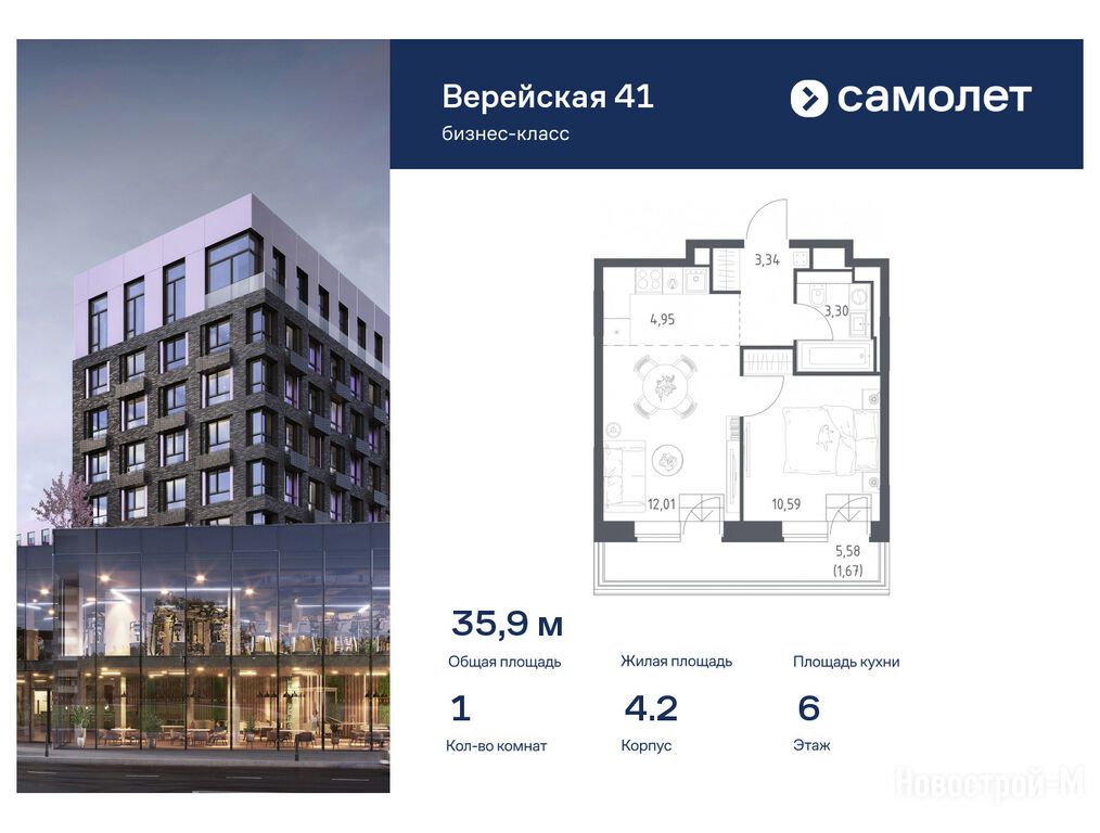Продается однокомнатная квартира в новостройке ЖК «Верейская 41» по адресу Москва, ЗАО, Можайский, корпус 4.2. Общая площадь квартиры - 35.86 кв. м. Тип проекта, по которому построен дом — Монолитно-кирпичный, компания-застройщик — АО СЗ «Самолет-Верейская», Группа «Самолет». Стоимость квартиры — 25 928 107 руб. Способы оплаты можно уточнить у продавца. Срок сдачи — 1 квартал 2026. Более подробная информация по телефону.