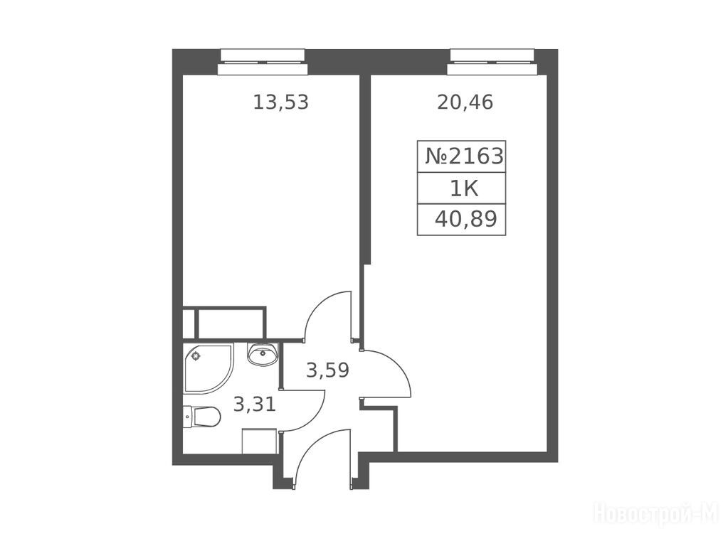 1-комн. помещение, 40.89 м2, 19 этаж