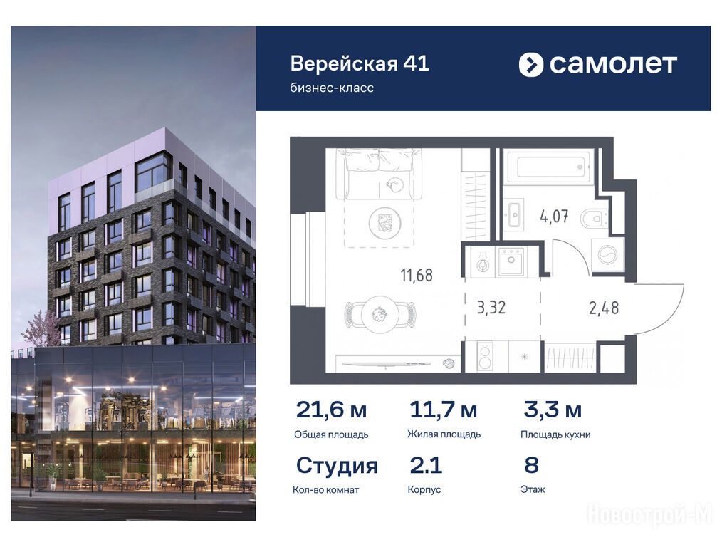 Продается студия в новостройке ЖК «Верейская 41» по адресу Москва, ЗАО, Можайский, МФК «Верейская 41»,корп. 2.1. Общая площадь квартиры - 21.55 кв. м. Тип проекта, по которому построен дом — Монолитно-кирпичный, компания-застройщик — АО СЗ «Самолет-Верейская», Группа «Самолет». Стоимость квартиры — 18 337 930 руб. Способы оплаты можно уточнить у продавца. Срок сдачи — 4 квартал 2025. Более подробная информация по телефону.