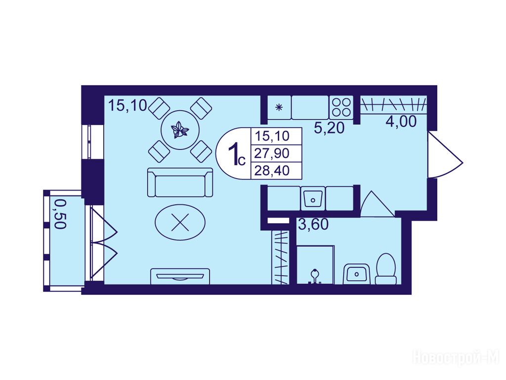 студия, 28.40 м2, 15 этаж