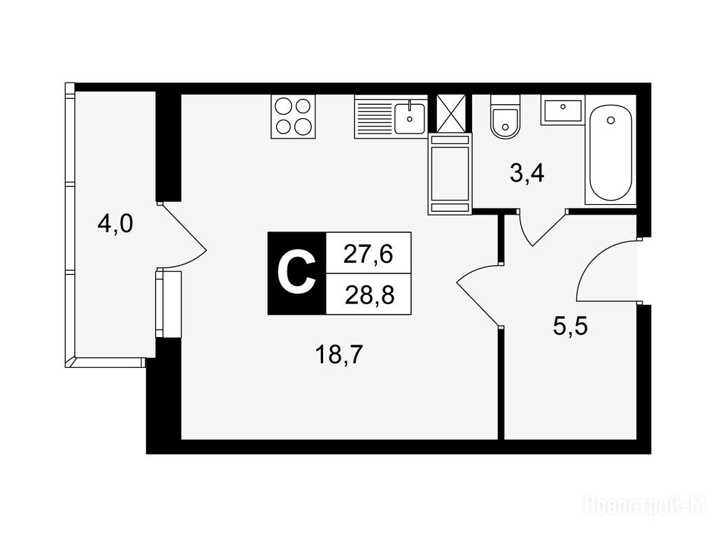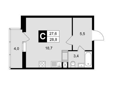 студия, 28.80 м2, 3 этаж