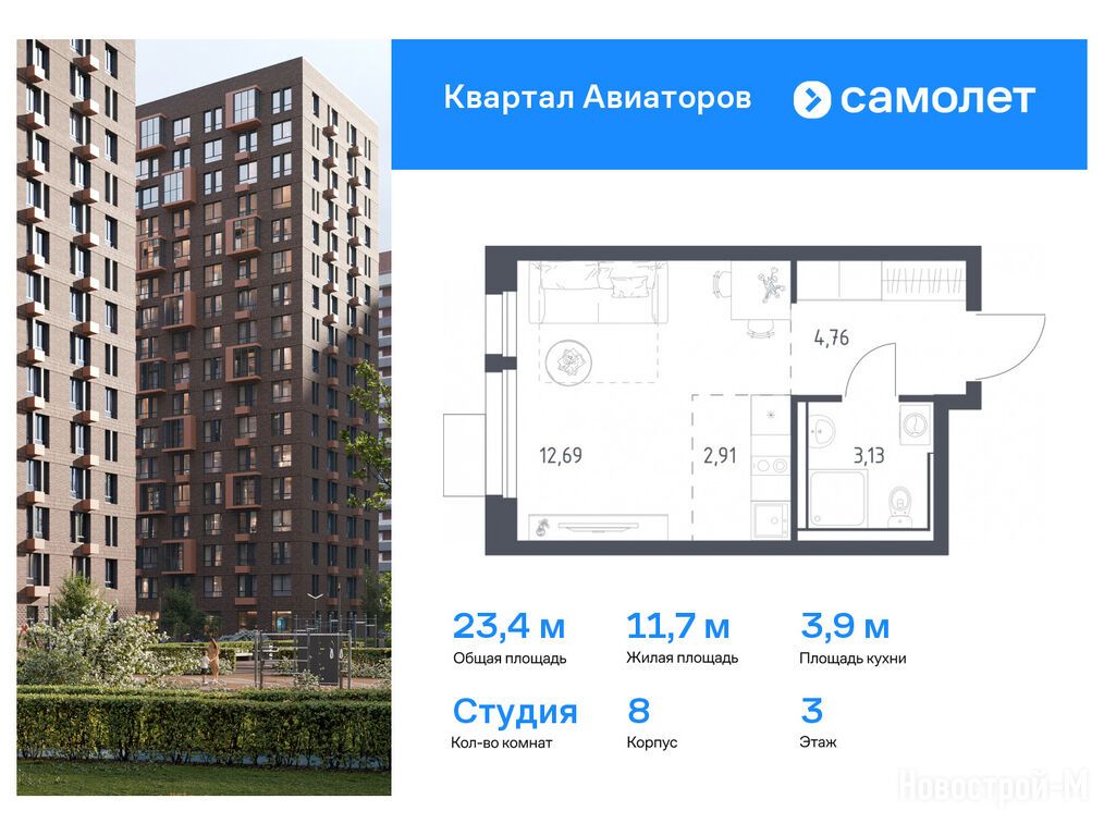 Продается студия в новостройке ЖК «Квартал Авиаторов» по адресу Московская область, Балашиха городской округ, Балашиха, ул. Кожедуба, корп. 8. Общая площадь квартиры - 23.4 кв. м. Тип проекта, по которому построен дом — Монолитно-кирпичный, компания-застройщик — ООО СЗ «Реновация-Балашиха», Группа «Самолет». Стоимость квартиры — 6 598 922 руб. Способы оплаты можно уточнить у продавца. Более подробная информация по телефону.