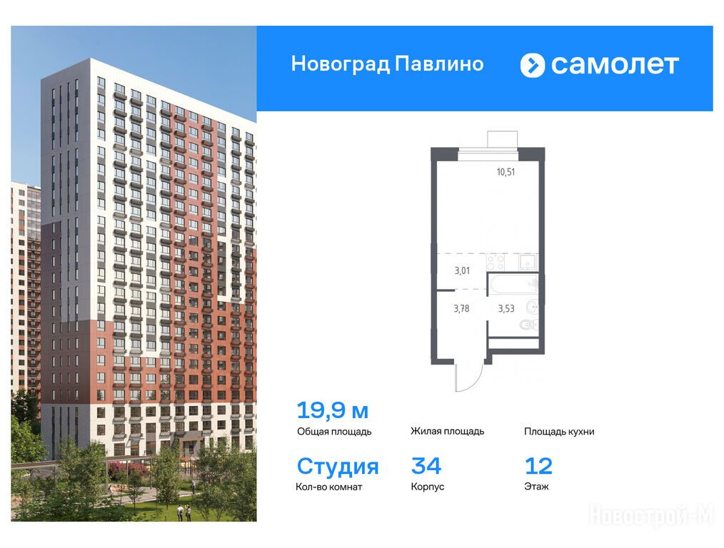 Продается студия в новостройке ЖК «Новоград Павлино» по адресу Московская область, Балашиха городской округ, Балашиха, мкр. Новое Павлино, ЖК «Новоград Павлино», корп. 34. Общая площадь квартиры - 19.9 кв. м. Тип проекта, по которому построен дом — Монолитно-кирпичный, компания-застройщик — Группа «Самолет», ООО СЗ «МИЦ-Инвестрой». Стоимость квартиры — 5 513 733 руб. Способы оплаты можно уточнить у продавца. Более подробная информация по телефону.