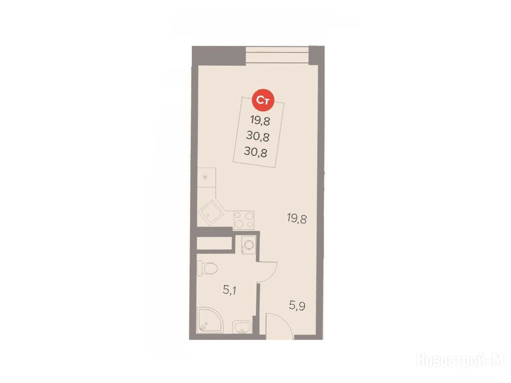 студия, 30.80 м2, 13 этаж