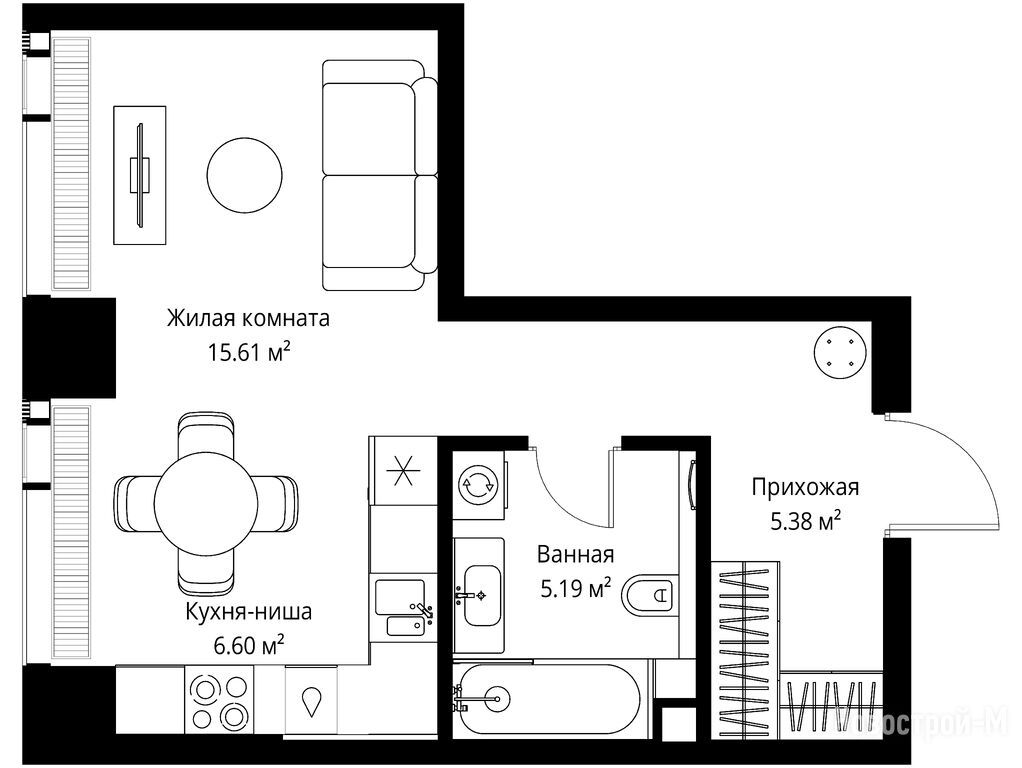 Пространство ощущается благодаря высоте потолков в 2,95 м. Отсутствие балконов, конечно, может расстроить, но панорамные окна во всю стену компенсируют этот недостаток, открывая прекрасный вид и наполняя квартиру светом.