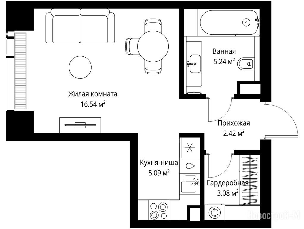 Пространство ощущается благодаря высоте потолков в 2,95 м. Отсутствие балконов, конечно, может расстроить, но панорамные окна во всю стену компенсируют этот недостаток, открывая прекрасный вид и наполняя квартиру светом.