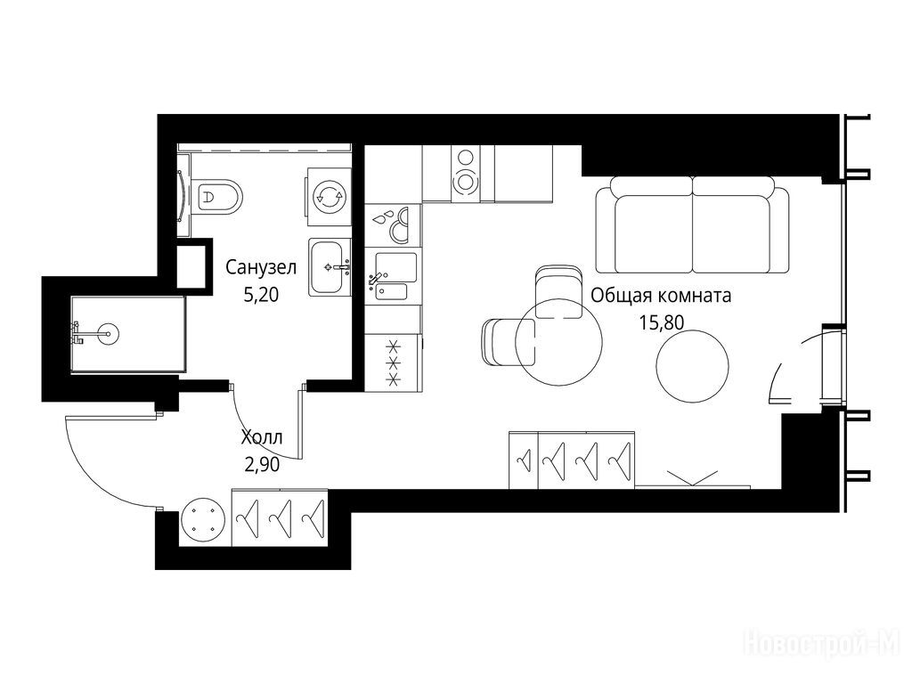 Пространство ощущается благодаря высоте потолков в 2,95 м. Отсутствие балконов, конечно, может расстроить, но панорамные окна во всю стену компенсируют этот недостаток, открывая прекрасный вид и наполняя квартиру светом.