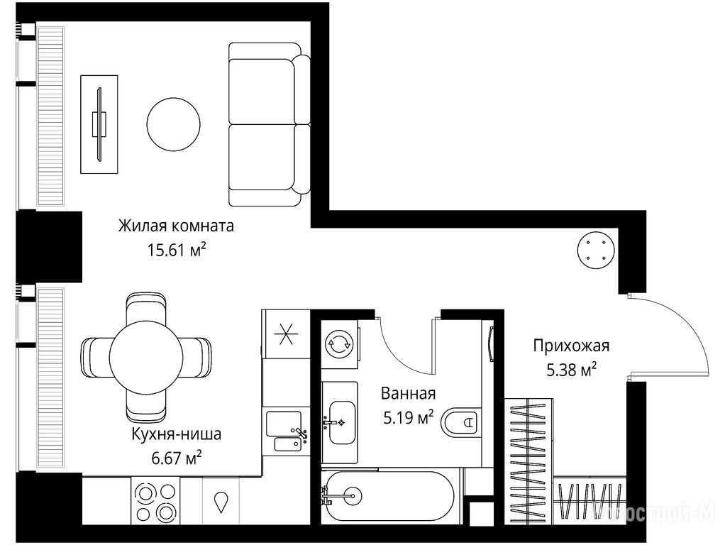 Пространство ощущается благодаря высоте потолков в 2,95 м. Отсутствие балконов, конечно, может расстроить, но панорамные окна во всю стену компенсируют этот недостаток, открывая прекрасный вид и наполняя квартиру светом.