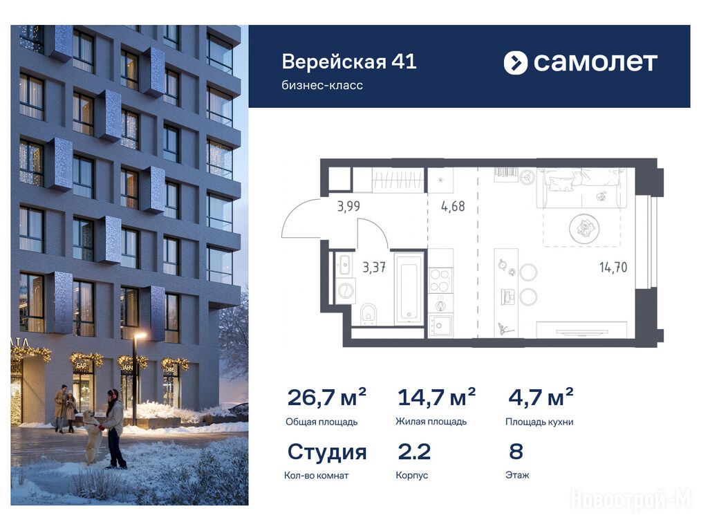 Продается студия-апартамент в новостройке ЖК «Верейская 41» по адресу Москва, ЗАО, Можайский, корпус 2.2. Общая площадь апартамента - 26.74 кв. м. Тип проекта, по которому построен дом — Монолитно-кирпичный, компания-застройщик — АО СЗ «Самолет-Верейская», Группа «Самолет». Стоимость апартамента — 22 812 131 руб. Способы оплаты можно уточнить у продавца. Срок сдачи — 1 квартал 2026. Более подробная информация по телефону.