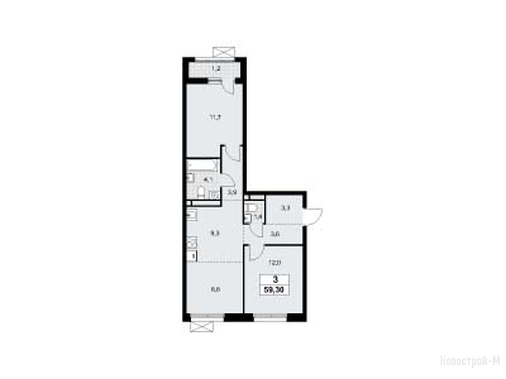 3-комн. квартира, 59.30 м2, 8 этаж