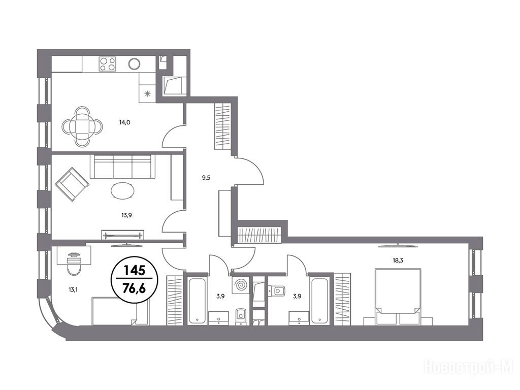 Присмотрели неплохую трешку в корпусе 1.3 на 72 кв. Больше всего понравилось, что окна на три стороны, это можно очень удачно обыграть в дизайне) Сам проект огромный, три очереди по четыре корпуса