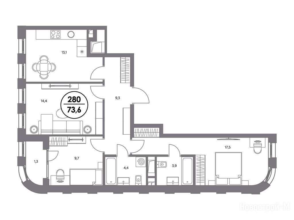Присмотрели неплохую трешку в корпусе 1.3 на 72 кв. Больше всего понравилось, что окна на три стороны, это можно очень удачно обыграть в дизайне) Сам проект огромный, три очереди по четыре корпуса