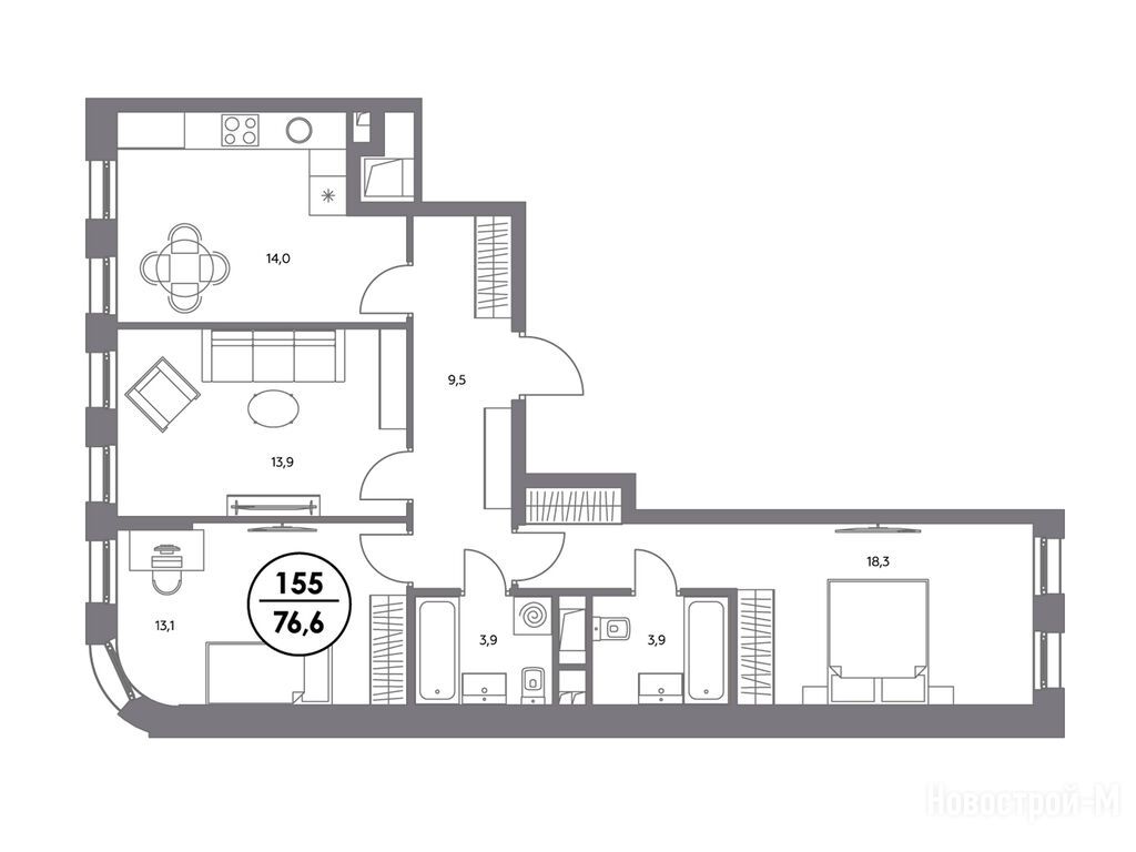 Присмотрели неплохую трешку в корпусе 1.3 на 72 кв. Больше всего понравилось, что окна на три стороны, это можно очень удачно обыграть в дизайне) Сам проект огромный, три очереди по четыре корпуса