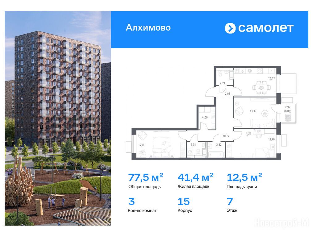 Продается трехкомнатная квартира в новостройке ЖК «Алхимово» по адресу Москва, ТиНАО, Новомосковский АО, Рязановское С/П, пос. Рязановское, вблизи д. Алхимово, ЖК «Алхимово», корп. 15. Общая площадь квартиры - 77.5 кв. м. Тип проекта, по которому построен дом — Монолитно-кирпичный, компания-застройщик — Группа «Самолет», ООО СЗ «Самолет-Алхимово». Стоимость квартиры — 23 216 759 руб. Способы оплаты можно уточнить у продавца. Более подробная информация по телефону.