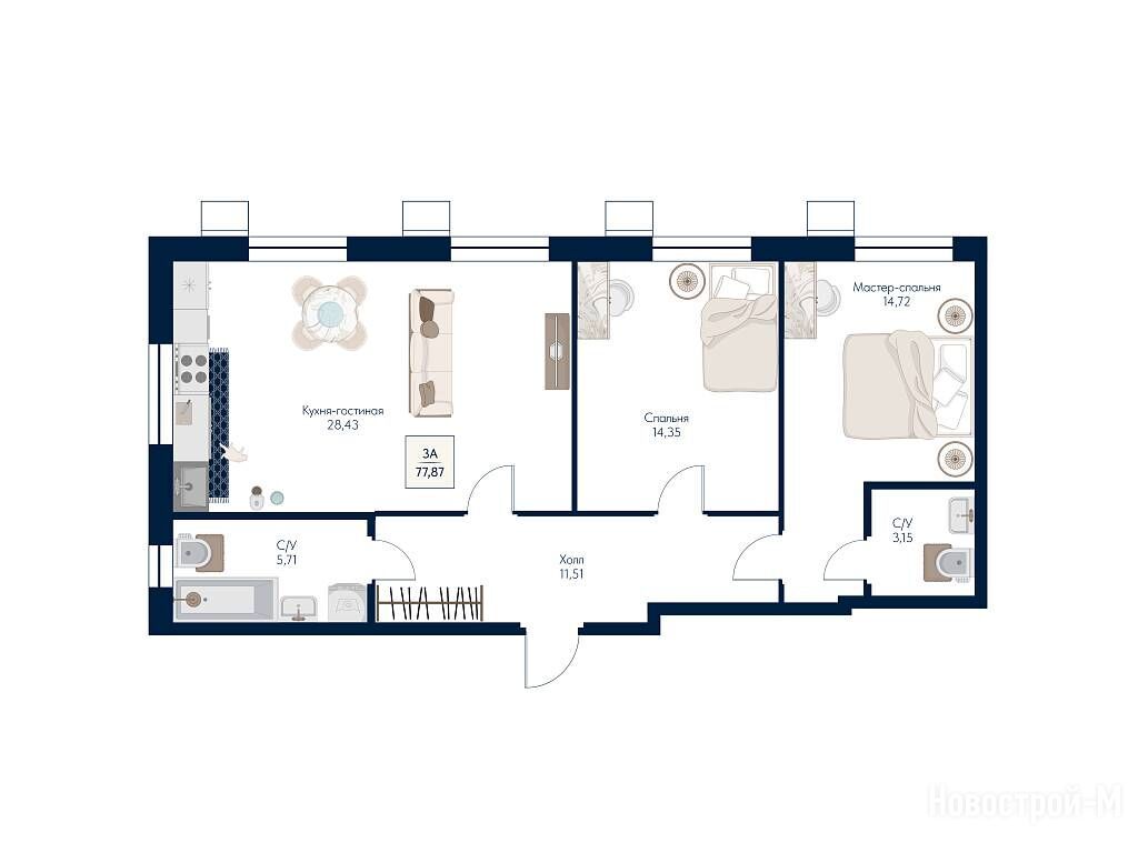 3-комн. квартира 77,59 м2 25 577 110