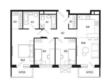 Расположение 3-комн. квартиры