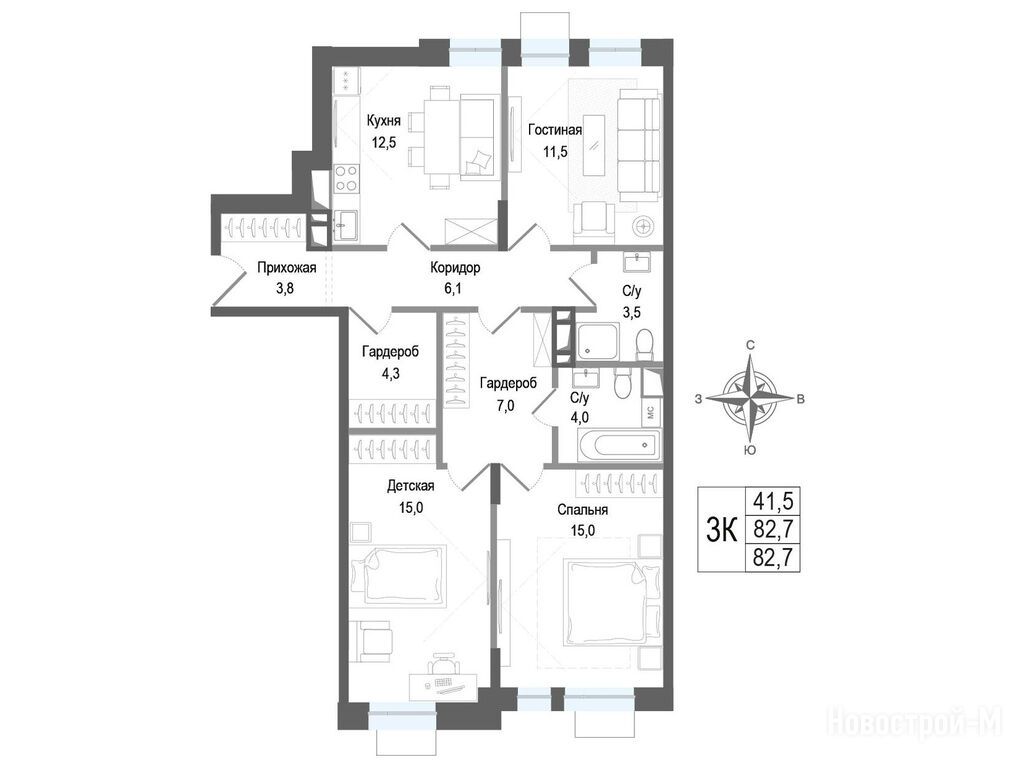 3-комн. квартира, 82.70 м2, 3 этаж