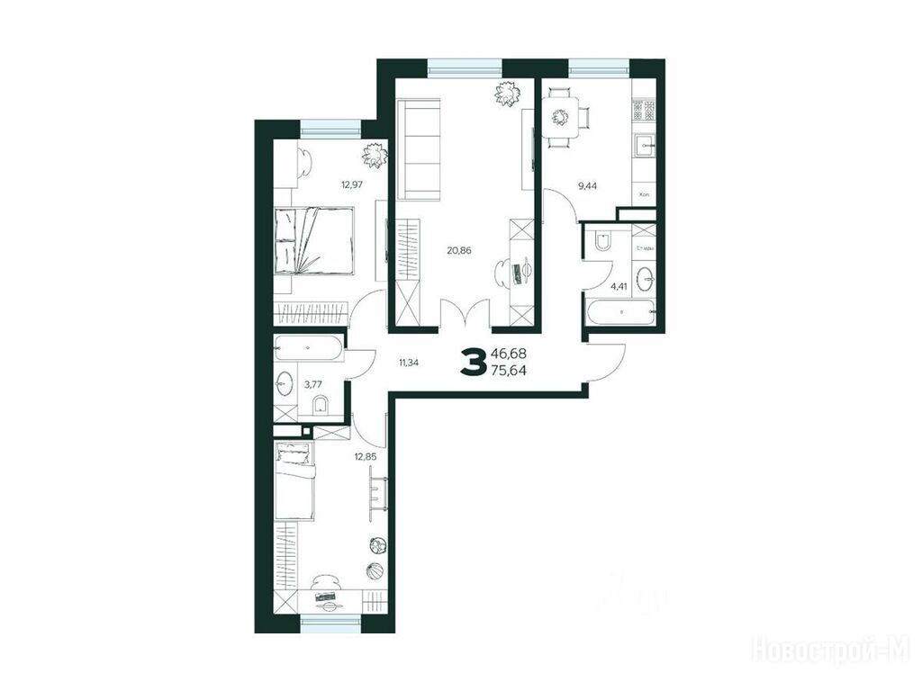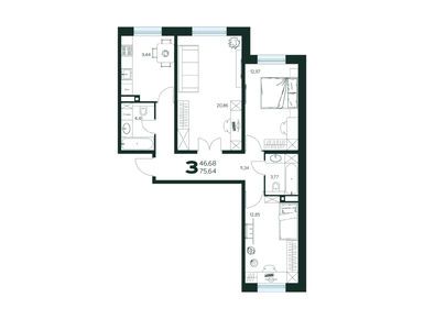 3-комн. квартира, 75.64 м2, 1 этаж