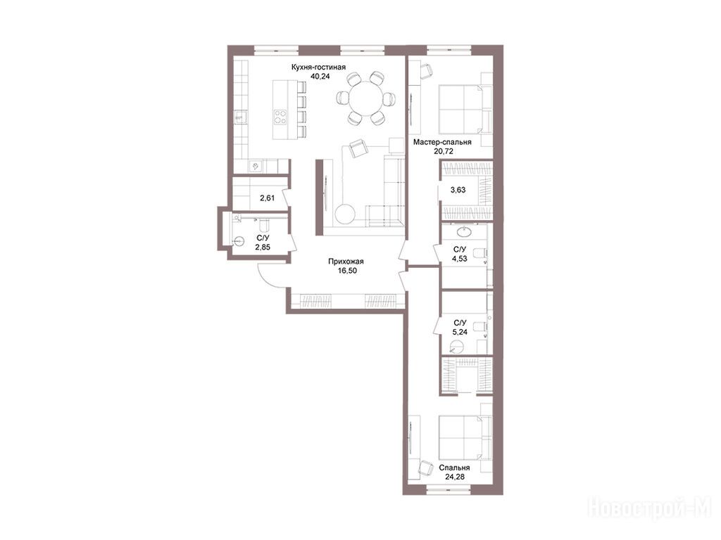 Планировки угловых многокомнатных шикарные! Мы забронировали 4-комнатную, где гостиная идет как бы в форме сектора круга и 3 окна по округлой стене сразу выходят на 2 стороны света. Кстати, это один из немногих жк, где застройщик предлагает отделку класса Premium либо Elite.