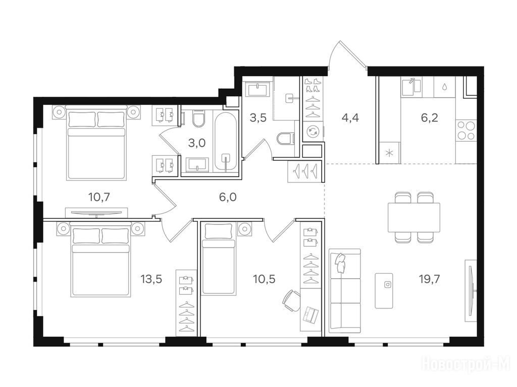 Трешки супер, есть окно в гардеробной, мастер-спальня удалена максимально от всех комнат, кухня-гостиная большая, можно зонировать спокойно. Смутил только длинный коридор-труба на 8 квадратов, пока не очень представляю как это будет выглядеть на деле.