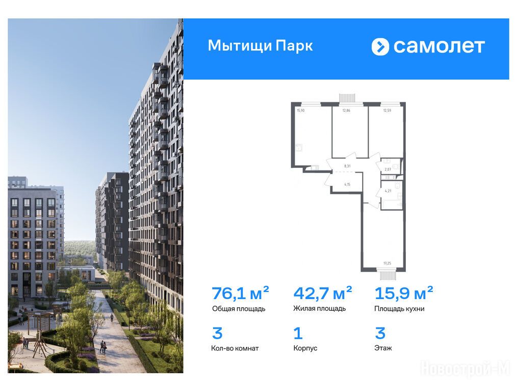 Продается трехкомнатная квартира в новостройке ЖК «Мытищи Парк» по адресу Московская область, Мытищи городской округ, Мытищи, ул Силикатная, корпус 1. Общая площадь квартиры - 76.1 кв. м. Тип проекта, по которому построен дом — Монолитно-кирпичный, компания-застройщик — ООО СЗ «Самолет-Мытищи», Группа «Самолет». Стоимость квартиры — 23 048 421 руб. Способы оплаты можно уточнить у продавца. Более подробная информация по телефону.