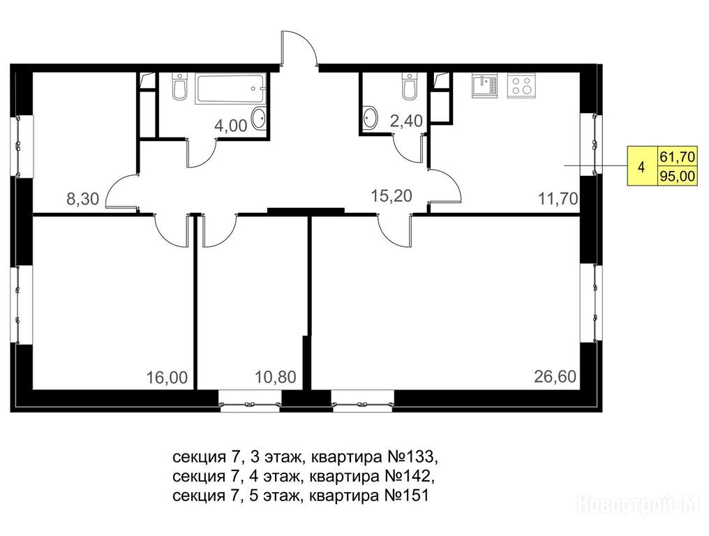 3-комн. квартира, 95.00 м2, 3 этаж